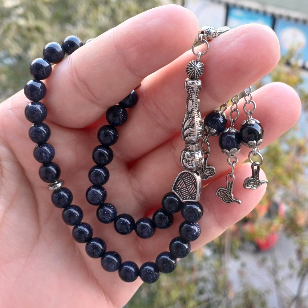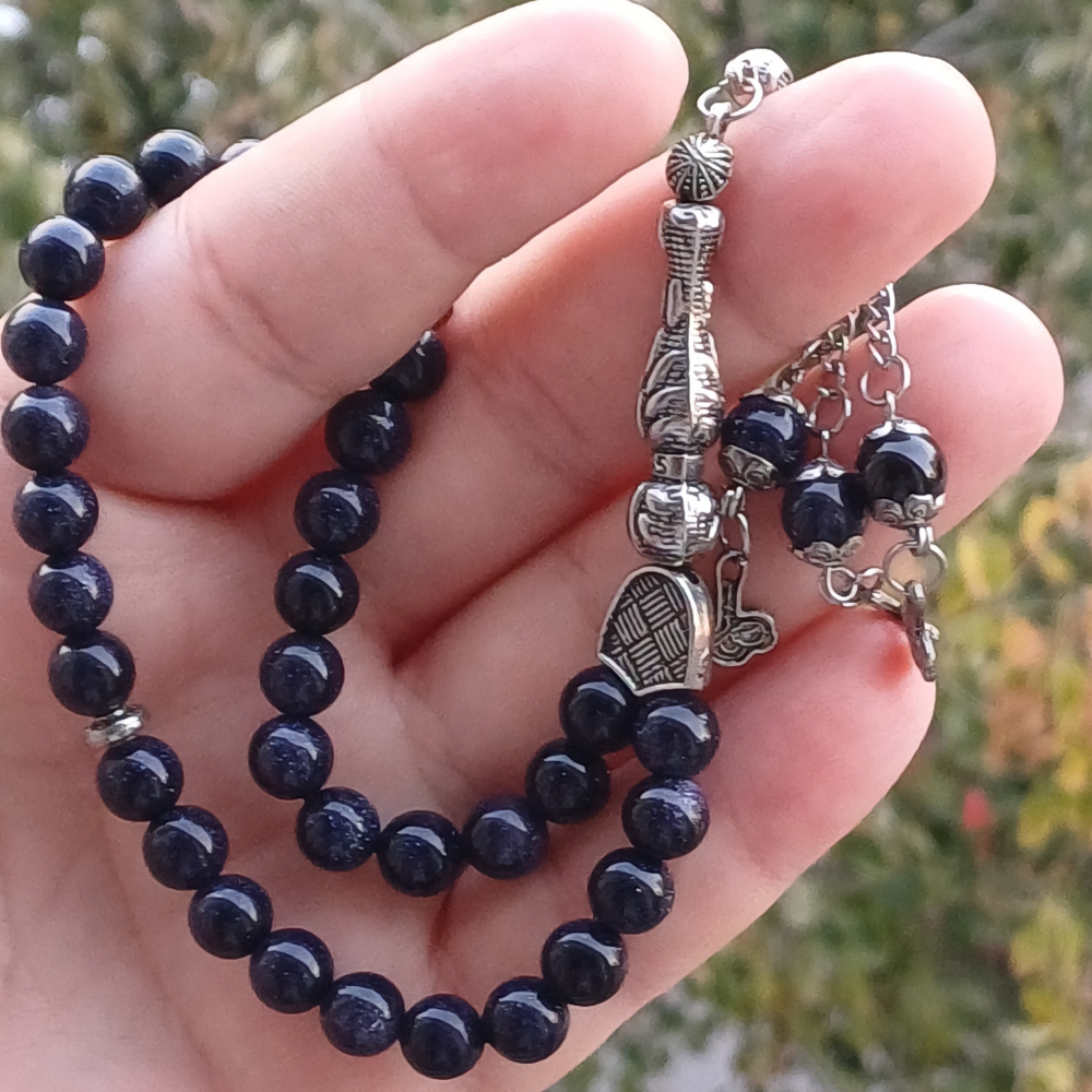 Rumi Şifa Yıldız Doğal Taş Tesbih, gökyüzünün büyüleyici ışıltısını taşıyan doğal yıldız taşı boncuklardan özenle hazırlanmıştır. Parlak lacivert tonları ve içinde yer alan minik altın parıltılar, evrenin sonsuzluğunu ve yıldızların enerjisini sembolize eder. Bu taş, hem ruhsal denge hem de zihinsel sakinlik arayanlar için güçlü bir enerji kaynağıdır.